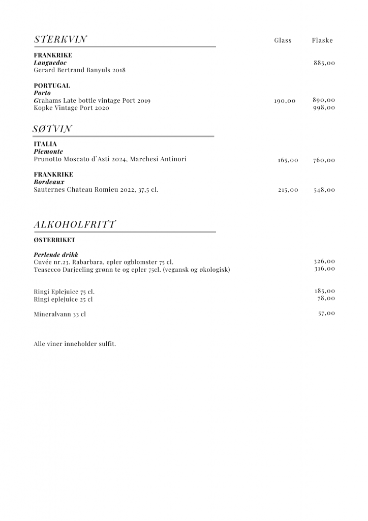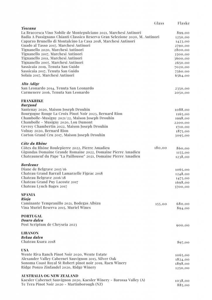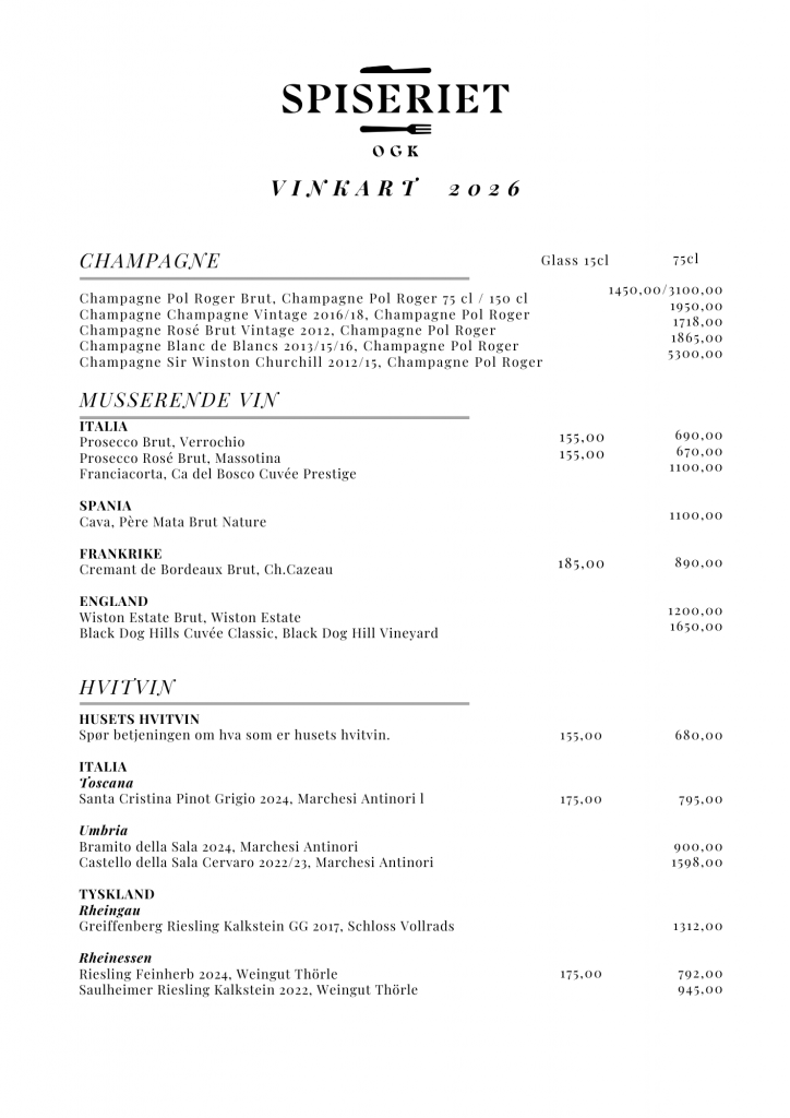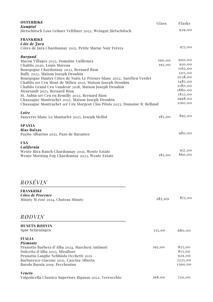 Vi inviterer deg til å utforske vårt spennende utvalg av viner fra mange kjente vinproduserende regioner i verden, med hovedvekt på Europa. Enten du er en erfaren vinkjenner eller «bare» liker et godt glass, har vi noe for alle smaker og anledninger. Fra friske hvite viner og fyldige røde til boblende musserende og elegant rosé. Vårt sortiment er utvalgt for å passe til vår mat samtidig som de forhåpentligvis vil gi deg en god og hyggelig smaksopplevelse.